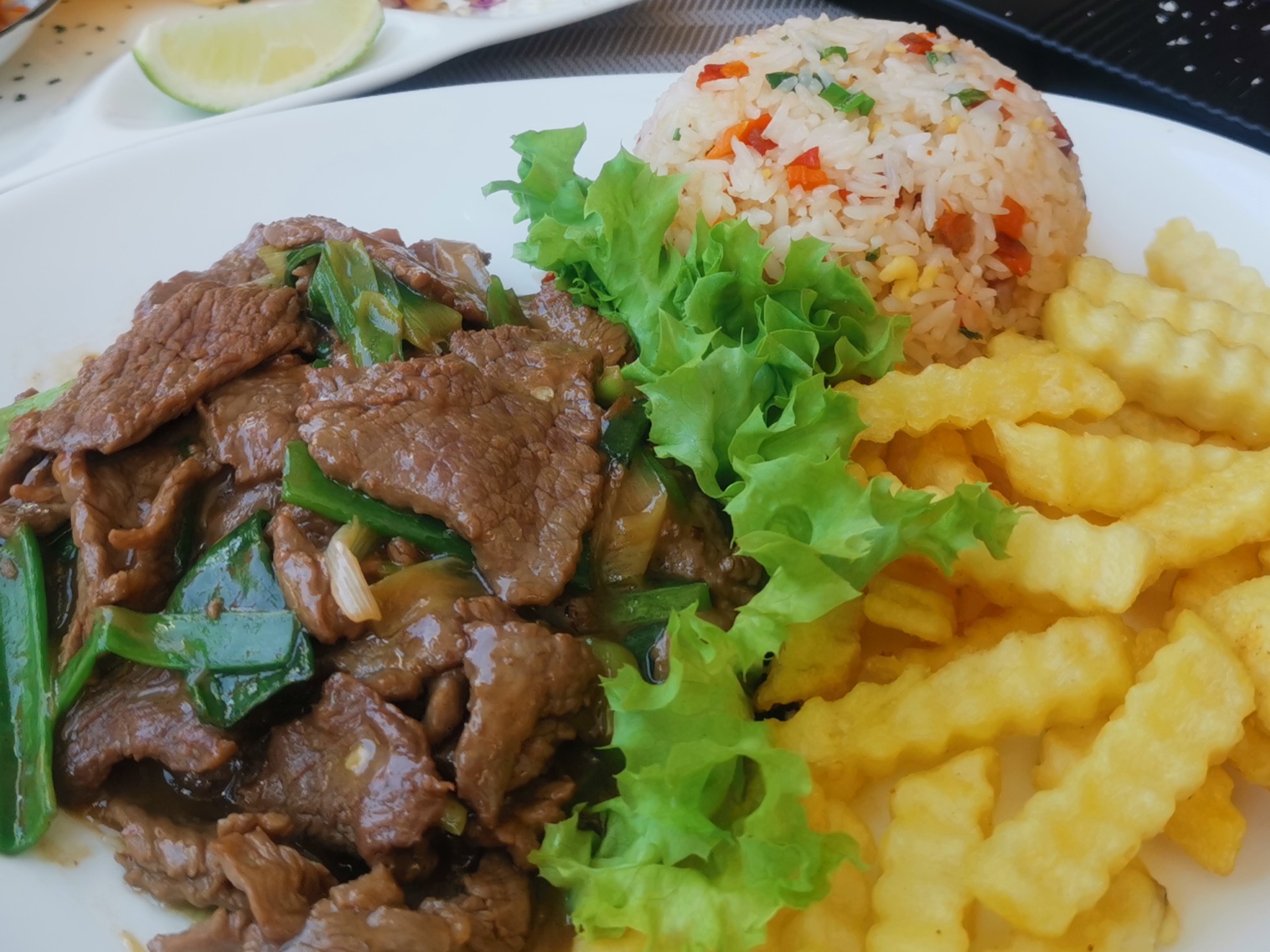 carne cebollin +arroz+papas frita